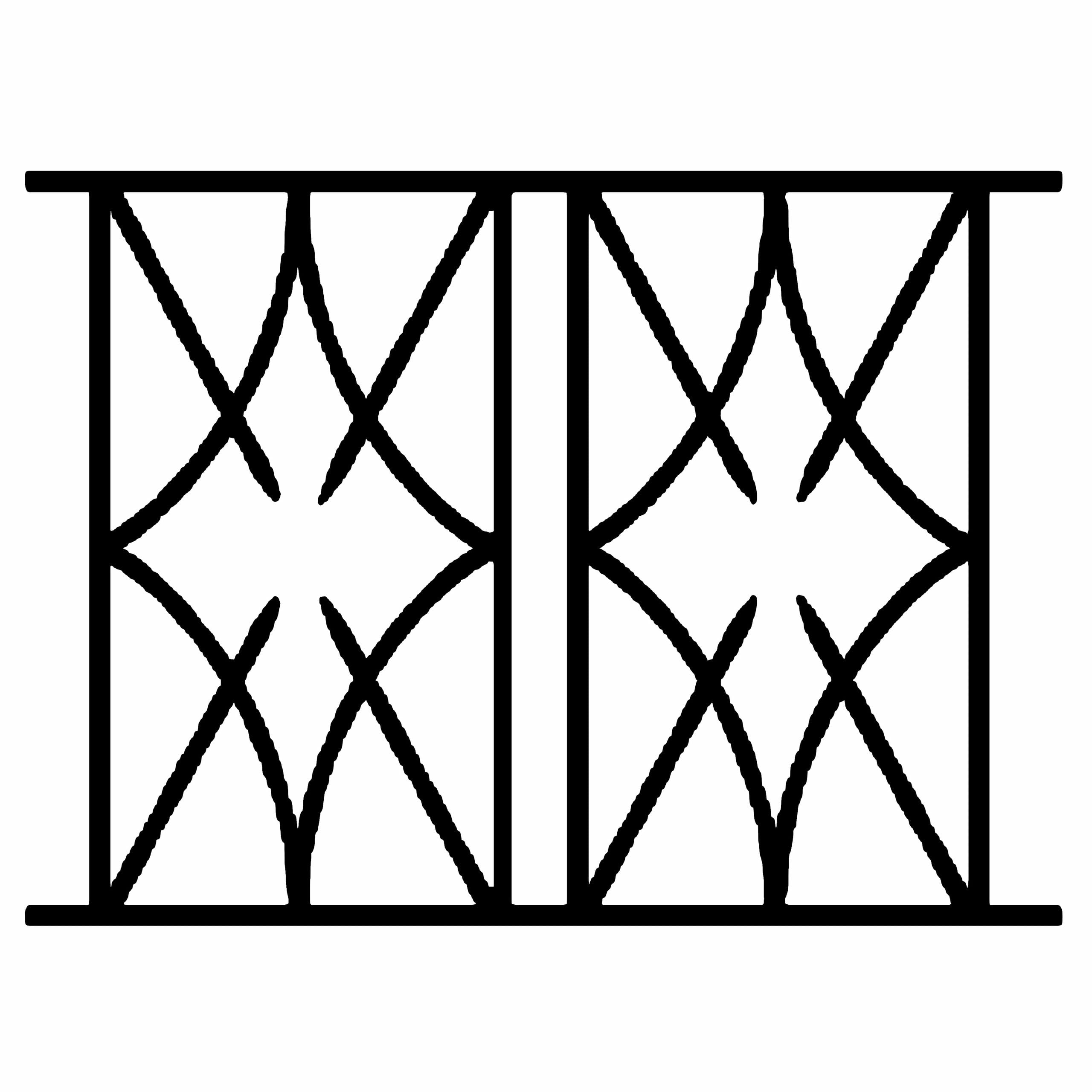 • Dimension de la grille Hauteur : 34 cm, Largeur : 110 cm. Cadre en fer plat 25x8mm et motif en carre plein 12x12mm. Double motif symetrique